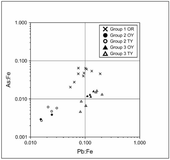 Group 1 sites (the originally red side panels) consistently showed the occurrence of significant amounts of lead, with a mean Pb:Fe ratio of 0.10, while arsenic levels were lower but still notable (mean As:Fe ratio of 0.05). Group 2 sites (the originally yellow central panels) differed significantly, with very low levels of both elements, with mean Pb:Fe and As:Fe ratios of 0.02 and 0.00, respectively. Finally, group 3 sites (the originally yellow upper register, Figure 5) showed the highest concentrations of lead, while arsenic was present only in trace amounts (mean Pb:Fe and As:Fe ratios of 0.13 and 0.01, respectively). Yellow ochre sites that had transformed to red (TY) showed no difference in lead and arsenic content in comparison to sites within the same panels that had not been transformed (OR).