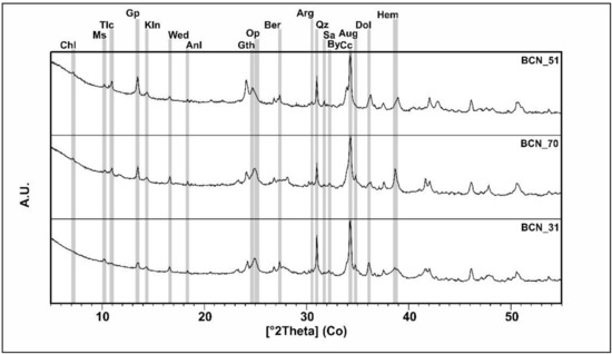 Representative XRPD patterns of the Herculaneum samples. The main reflexes of the identified minerals are indicated by the following abbreviations: Chl = chlorite, Ms = muscovite, Tlc = talc, Gp = gypsum, Kln = kaolinite, Wed = weddellite, Anl = analcime, Gth = goethite, Op = opal-CT, Ber = bernalite, Arg = aragonite, Qz = quartz, Sa = sanidine, By = bytownite, Cc = calcite, Aug = augite, Dol = dolomite, and Hem = hematite.