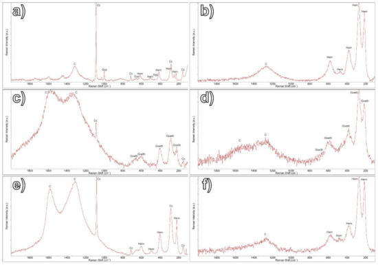 The Raman spectra of the red paint layers (Figure 7e), both original and transformed, are also characterized by the presence of sharp calcite peaks of the carbonated binder, associated with a series of well-defined broad Raman peaks between 100 cm−1 and 650 cm−1 related to the occurrence of hematite from the ochre pigment. Distinctive peaks of goethite are always totally absent. Furthermore, strong broad bands centered at 1332 cm−1 and 1582 cm−1 are present, typical for charcoal and indicating the addition of carbon black to the pigment mixture. The lumps of pigment are characterized by spectra comparable to those of the pink-tinted plasters (Figure 7f).