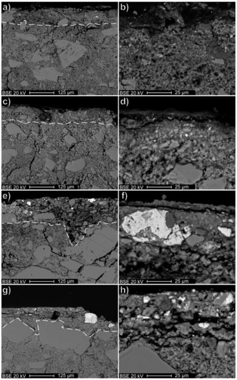 Representative backscattered electron (BSE) images of the Herculaneum samples (interfaces between plasters and paint layers are indicated by dashed lines): (a) BCN_28, upper portion; (b) BCN_28, detail of the paint layer; (c) BCN_W1_03, upper portion; (d) BCN_W1_03, detail of the paint layer; (e) BCN_31, upper portion; (f) BCN_51, detail of the paint layer; (g) BCN_67, upper portion; (h) BCN_67, detail of the paint layer.