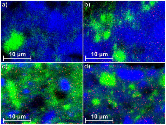 High-resolution EDS mapping on the Herculaneum samples: composite images obtained through RGB convolution of the elaborated elemental maps of lead, iron, and calcium, placed in the R, G, and B channels, respectively. (a) BCN_28; (b) BCN_W1_03; (c) BCN_51; and (d) BCN_67.