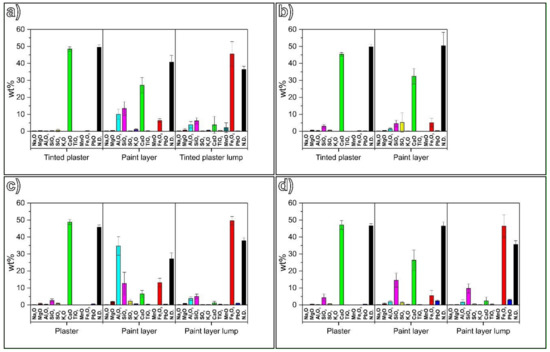 Histograms reporting mean compositional profiles of finishing plasters, paint layers, and pigment lumps (when available) in the samples analyzed through wavelength-dispersive X-ray spectroscopy system (EMP-WDS). Error bars are reporting the 95% confidence interval of the mean. (a) BCN_28; (b) BCN_W1_03; (c) BCN_51; and (d) BCN_67.