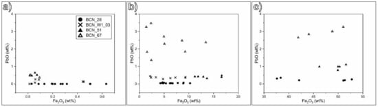 Marked heterogeneities in the four samples analyzed are also evident when analyzing PbO concentration trends and their correlation with Fe2O3 in the paint layer matrices. BCN_28 is characterized by the absence of significant lead oxide fractions, while it is present in similar and homogeneous amounts in the analyzed spots of BCN_W1_03 and BCN_51 (mean concentrations of 0.3637 wt% and 0.4081 wt%, respectively), regardless of iron oxide concentrations (Figure 12). Sample BCN_67 shows a difference in the presence of significantly higher PbO concentrations (mean value of 2.4037 wt%), more variable in the analyzed spots but still uncorrelated with Fe2O3 (Figure 12).