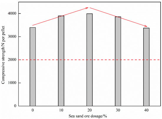 3.2. Effect of Sea Sand Ore Dosage on the Compressive Strength of Oxidized Pellets