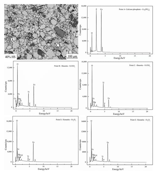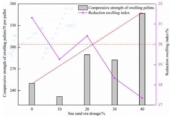 - As the amount of unground sea sand ore used increased, the reduction swelling index of the pellets showed a downward trend, while the compressive strength of the pellets gradually increased after reduction swelling. When the amount of sea sand ore used was 40%, the reduction swelling index of the pellets was the lowest, which was 17.35%, and the compressive strength of the pellets after reduction swelling was the highest, which was 346.78 N/pellet. According to the results of SEM-EDS, the phases of oxidized pellets were mainly hematite, ilmenite, silica, and calcium phosphate.