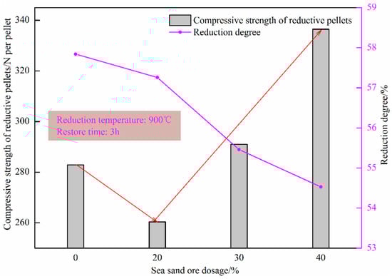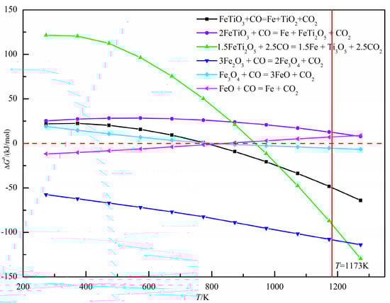 - According to the ∆Gθ-T diagram of the reduction process of oxidized pellets with sea sand ore, as the amount of New Zealand sea sand ore used increased, the content of FeTiO3 in the oxidized pellets increased. When the reduction temperature was 1173 K, the reduction product of FeTiO3 was metallic iron, but not FeTi2O5. Therefore, the reduction of FeTiO3 in the oxidized pellets was limited, and the degree of reduction gradually decreased.