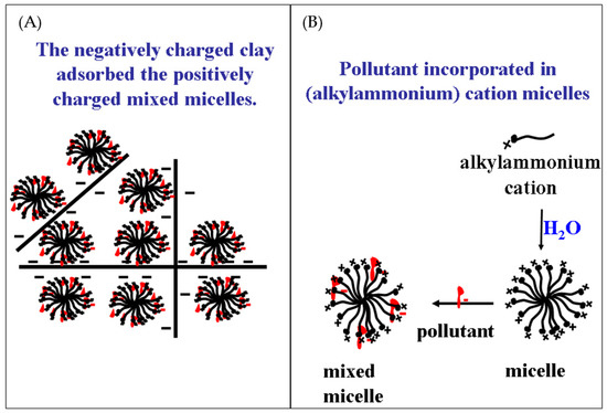 Figure 1. (A) The powder of the clay-mineral, such as Na-montmorillonite or a clay, such as Na-bentonite is introduced and a complex is spontaneously formed by interactions of the posi-tively charged micelles with the negatively charged clay-mineral or clay. In this scheme the mi-celle-clay complex includes the herbicide. In the absence of herbicide or pollutant molecules this Figure represents a scheme of the first stages of preparation of a micelle-clay complex. It should be noted that the sizes of micelles are in the nanometer range, whereas the lateral dimensions of the clay platelets (whose projections in the plane of the page are seen) are about 1 µm and their width is about 1.5 nm. (B) The salt of an organic cation with a long alkyl chain is introduced into a vessel with water. Above a concentration denoted critical micelle concentration (CMC) micelles of the cation form spontaneously in sizes of a few nanometers. The red colored molecules “pollutant” are herbicide molecules in the case of a preparation of slow release formulations of herbicides.
