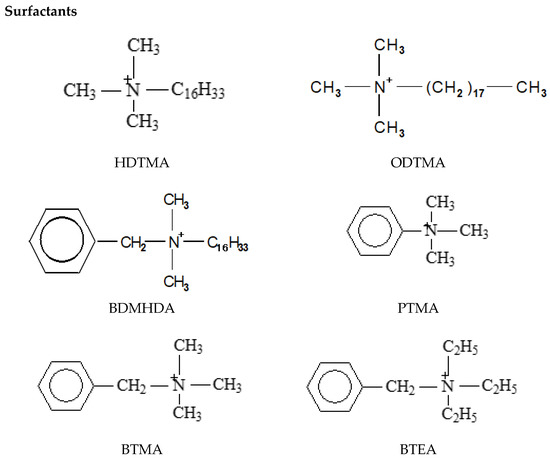 In the micelle-clay approach, the idea was to incorporate the anionic herbicide in the positively charged micelles of quaternary ammonium cations (QACs), which would be later adsorbed by the negatively charged clay-mineral montmorillonite. This is illustrated in Figure 1. As a part of the design, the QAC chosen was octadecyltrimethylammonium (ODTMA), which includes an alkyl chain with 18 carbon atoms (Figure 2). Its CMC (critical micelle concentration) is 0.3 mM, which implies that at such concentration micelles of ODTMA are spontaneously formed. At higher ODTMA concentrations, e.g., 12 mM, 11.7 mM of ODTMA are in micellar form, whereas ODTMA monomers are present at a concentration of 0.3 mM. This implies that at such concentration 97.5% of ODTMA cations in solution are in micellar form. Other frequently used micelles were composed of the organic cation benzyldimethylhexadecylammonium (BDMHDA), which has a phenyl ring; its alkyl chain includes 16 carbon atoms, and its CMC is 0.6 mM (Figure 2). Its choice was intended to maximize the interactions with the micelle-clay complex of herbicides which also possess a phenyl ring.