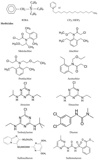 Structural formulae of several herbicides which were studied in the context of slow release formulations, and organic cations, which were used in modifying clays and clay minerals are shown in Figure 2.