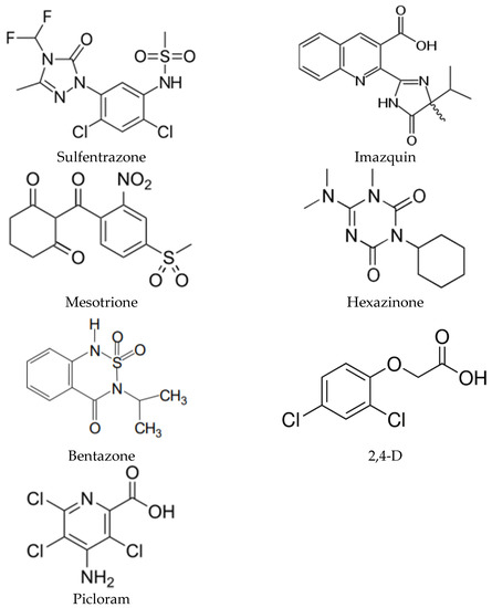 “Herbicides” are used for weed management in annual and perennial crops and in non-agricultural areas. They comprise approximately 46% of the total global use of pesticides [1]. Herbicides can be applied by a variety of means including ground and aerial sprayers, either pre-emergence on bare soil, or post-emergence, when the crop is present—as a directed spray or over-the-top. Regardless of the application method used, all herbicides reach the soil as the parent substance, or as degradation products and might be exposed to various dynamic processes. Depending on soil composition, structure, pH and water content, the applied herbicide (or its byproducts) can be taken up by plants and other macro- and/or micro-organisms. It might be adsorbed to clay and organic matter surfaces, chemically decomposed, volatilized, or photodegraded. The herbicide can migrate from the site of application and be eroded by run-off or leach down to deeper soil layers [2]. It should be noted that only the herbicide fraction present in the soil solution is available for biological activities.