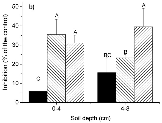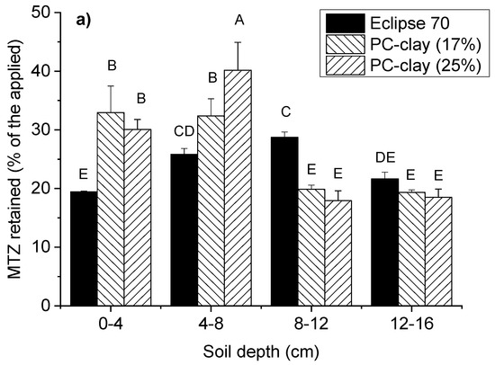 A good correspondence was obtained between the release experiments by using “soil funnels” and the leaching studies with “soil columns”. After six irrigation events in “soil funnels”, the release of metribuzin from PC-clay formulations prepared with ai contents of 17 and 25% w:w was reduced by 73 and 56%, respectively [61]. Soil columns of 16 cm length which were watered with 70 mm of rain after herbicide application, and sliced after 24 h to determine the remaining amount at several depths, yielded a better performance of the PC-clay formulations than the commercial (Eclipse 70) (Figure 3). In the case of the commercial formulation, retention of the herbicide in the upper two soil layers was significantly lesser than those with PC-clay ones. The amount remaining in the upper layer was 20% of the amount applied of the commercial formulation. In comparison, the remaining herbicide in PC-clay formulations amounted to 33% herbicide for PC-clay (17%) and 30% for PC-clay (25%). In the following segment, the amounts were also higher for PC-clay formulations, whereas that of the commercial formulation was significantly higher for the following layer. This leaching pattern was paralleled with the reduction in fresh weight per shoot of Setaria viridis in the two upper layers. Enhanced bioactivity by using PC-clay formulations was impressive in the upper layer (Figure 3b).