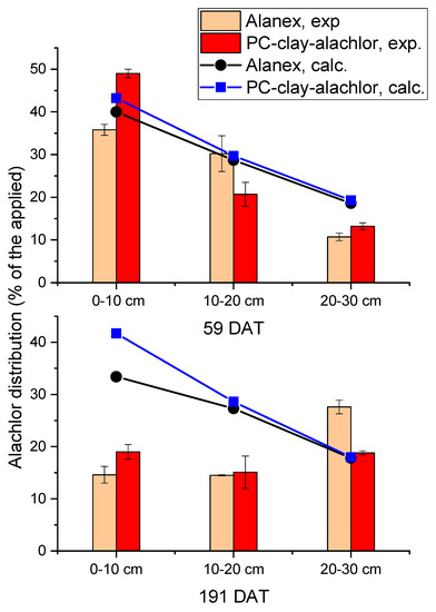 Figure 4. Distribution of alachlor applied as a commercial formulation (Alanex, 48% ai EC) and as a PC-clay formulation (40% ai) in soil depth 59 and 191 DAT. (Adapted from [60].).