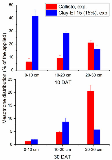 Mobility of designed formulations was also followed by using soil columns. The efficiency of sulfentrazone and metolachlor from micelle-clays [52] was demonstrated along soil layers at several depths by using a bioassay based on shoot growth inhibition of a test plant foxtail. A significant improvement in weed control and reduced leaching, in comparison with the commercial formulations was obtained with both micelle-clay formulations. In the case of metolachlor, the new formulation yielded more growth inhibition in the layer 0–3 cm and significantly less inhibition at depths above 15 cm, than the commercial formulation (Dual Gold), indicating less leaching of the active substance with the application of the new formulation, and good biological activity of the herbicide. In the case of sulfentrazone, the new formulation yielded 100% inhibition in the layer below a depth of 3 cm vs. less than 50% inhibition by the commercial formulation Boral.