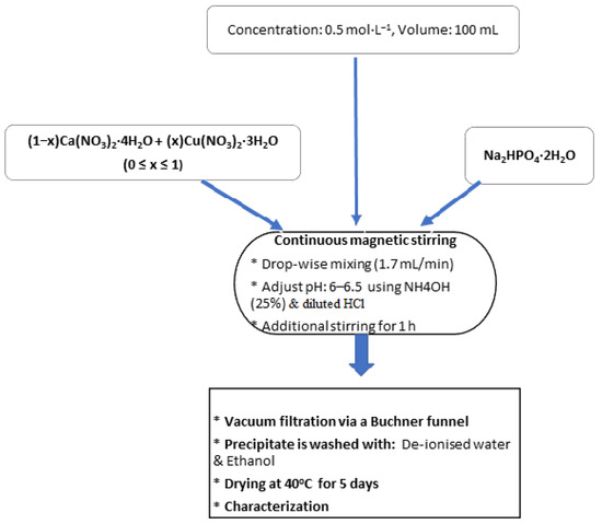 Calcium nitrate tetrahydrate and copper(II) nitrate trihydrate came from LOBA Chemie, India, while sodium dihydrogen orthophosphate dihydrate (NaH2PO4·2H2O) was purchased from Techno Pharmchem, India. A water purification system (PURELAB option-Q, ELGA, High Wycombe, UK) was used to prepare distilled water (0.055 µS/cm). Each component was weighed using a digital analytical balance (EX324N, OHAUS, Parsippany, NJ, USA). Stirring was performed with the use of a magnetic stirrer (ISOTEMP, Fisher Scientific, Shanghai, China).