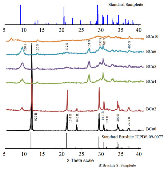 The gradual increase from 0.25 to 1.0—and eventually to 1.5 (patterns BCu4 to BCu6)—in the Cu/Ca molar ratio in the starting solution led to an increase in the degree of Ca replacement with Cu. Simultaneously, brushite disappeared, and only sampleite-like mineral precipitated. Thus, at higher molar ratios, the intensity of sampleite-like mineral peaks would increase in the XRD patterns. Eventually, a semi-crystalline structure in the pattern of BCu10 of the precipitate formed when a Cu/P ratio of 1.0 was used.