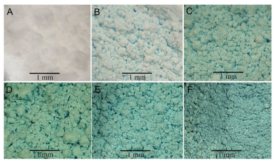 Figure 3 shows photographs of the Ca-Cu phosphate compounds produced in this research. Typical for pure CaPs, brushite appears as a white powder; see Figure 3A, Bcu0 [30]. The second compound, Figure 3B, is white in color with a clear presence of blue tones, but in smaller quantities, indicating the presence of the two minerals together: brushite (white) and sampleite (blue) [33]; see Figure 3. In turn, the compounds BCu4–BCu6 turn blue with an increased amount of copper, as shown in Figure 3C–E, where only the sampleite–like mineral is present. Finally, the blue compound Bcu10 appears after complete replacement of calcium with copper; see Figure 3F.