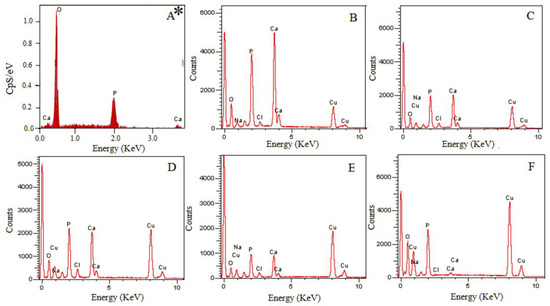 EDX analysis of (A) BCu0, (B) BCu2, (C) BCu4, (D) BCu5, (E) BCu6, and (F) BCu10 compounds. * Different scale of measurements.