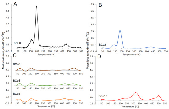 Differential thermogravimetric analysis (TGA) of Ca-Cu phosphates, (A) BCu0, (B) BCu2, (C) BCu4, BCu5, and BCu6, and (D) BCu10 compounds.
