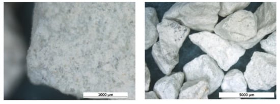 The investigated clinoptilolite-rich tuffs are light-colored with the shade of white for the Ukrainian tuff and green for the Slovakian (Figure 1 and Figure 2). The rocks are fine-grain with the massive and compact structure (Figure 1 and Figure 2). The Slovakian tuff can be marked out by the larger mineral assemblages disseminated through the rock (Figure 2). The macroscopic examinations have indicated that the most noticeable minerals in the Ukrainian tuff are quartz (with resinous luster) and iron oxides mineralization (fine orange spots) followed by feldspars, biotite (fine dark spots), and muscovite flakes (silver flakes).
