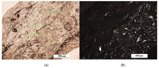 Ukrainian clinoptilolite-rich tuff. The remains of the volcanic glass in the form of a wavy laminated matrix (green arrows). Optical microscope, polarized transmitted light–PPL image (a). Optical microscope, polarized transmitted light–XPL image (b).