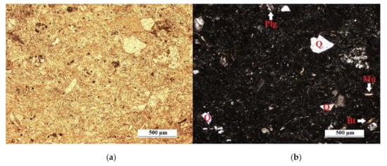 Ukrainian clinoptilolite-rich tuff. Crystalloclasts (Q—quartz, Plg—plagioclase, Mu—muscovite, Bt—biotite) scattered in the fine-crystalline rock matrix. Optical microscope, polarized transmitted light–PPL image (a). Optical microscope, polarized transmitted light–XPL image (b).