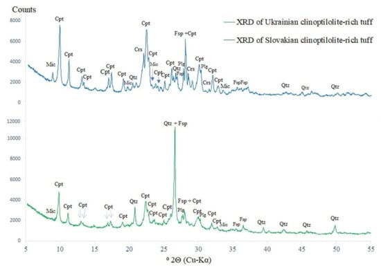 XRD patterns of clinoptilolite-rich tuffs from Slovakia and Ukraine. (Cpt—clinoptilolite, Mic—mica group minerals, Qtz—quartz, Fsp—K-feldspar, Plg—plagioclase, Crs—cristobalite).