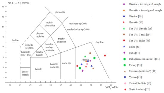 Figure 9 shows the chemical classification of the volcanic rocks (TAS diagram) with the clinoptilolite-rich tuffs from the most representative deposits in the world and investigated tuffs as well. According to the TAS diagram (Figure 9), all of the zeolitic tuffs except the tuff from the Idaho deposit are assigned to the dacite plot. The clinoptilolite-rich tuff from Idaho belongs to the rhyolitic one, displaying the most SiO2-enriched tuff.