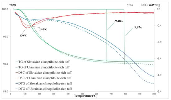 In Figure 10, the TG-DSC curves of the clinoptilolite-rich tuffs from the Ukrainian and Slovakian deposits are showed. The thermal analysis indicated in both cases the presence of a single, small but broad endothermal peak with the maximum at 120 °C and 140 °C for Slovakian and Ukrainian sample, respectively. The endothermal effects ended at 680 °C and 800 °C with mass loss of 9.48% and 9.87%. The fastest mass loss in samples can be observed from 65 to 300 °C, and it is associated with mass losses of about 6.84 wt % for the Slovakian and 6.97 wt % for the Ukrainian tuff. The endothermal effects visible for both tuffs are attributed to the dehydration of the zeolite minerals. It is compelling that the DSC curves for both studied zeolitic tuffs have not revealed any drastic transition in heat flow up to 1000 °C. It implies that the total structural decomposition of the examined clinoptilolite zeolites occurs at temperature over 1000 °C. However, it needs to be verified by the thermal analysis at temperature higher than 1000 °C and requires XRD analysis to detect any structural changes in clinoptilolite as the result of an amorphization.