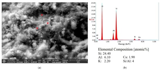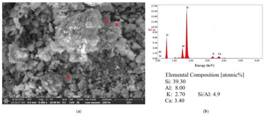 SEM image of the clinoptilolite in Slovakian tuff (EDS spots—red forks) (a) and its EDS microanalysis (b).