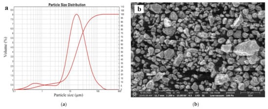 Particle size distribution of the clinoptilolite powder obtained by mineral processing of the Slovakian tuff (a); SEM images of the particles morphology (b).