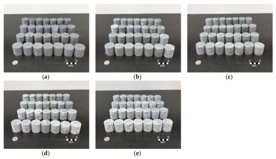 Rock samples of the Gonamsan intrusion for laboratory experiments: (a) underground ore, (b) discovered ore, (c) gabbro, (d) monzodiorite, and (e) quartz monzodiorite.