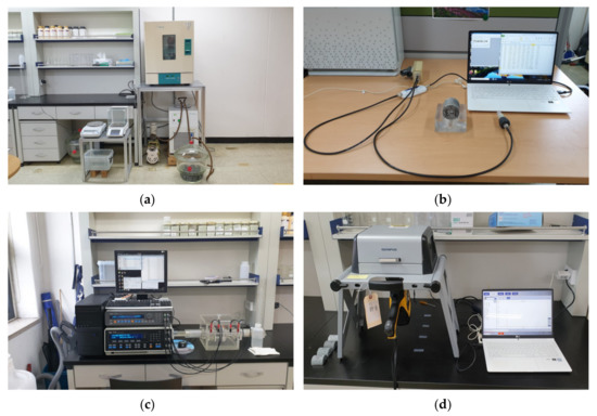 Figure 3a shows the density measurement system. The dehydrated grain mass was measured in air after dehydrating the rock samples in an oven at 110 °C for 24 h. The water-saturated mass was measured in the air after saturating the rock samples with a NaCl 0.001 M aqueous solution using a vacuum pump, in which the aqueous solution was injected in the rocks at a constant rate. The mass was measured using an electronic scale (±0.01 g).