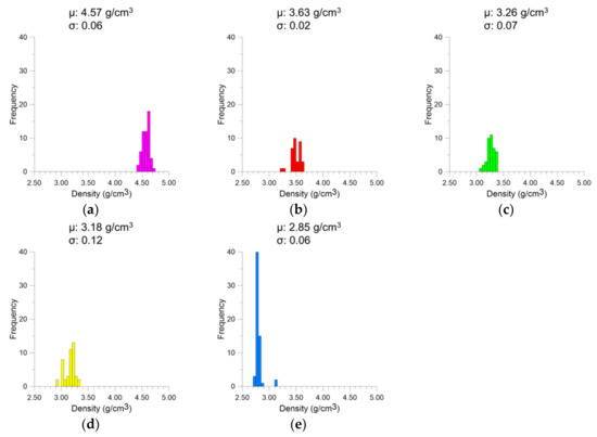 Histograms of density of rocks including mean (μ) and standard deviation (σ) of (a) underground ore, (b) discovered ore, (c) gabbro, (d) monzodiorite, and (e) quartz monzodiorite.