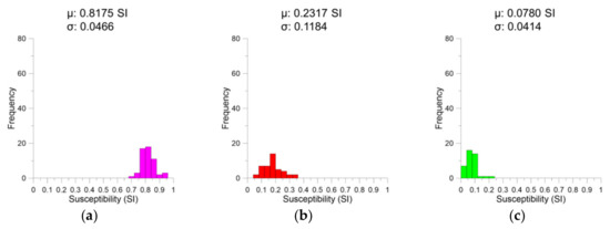 Figure 5 shows the histograms and statistics of susceptibility. The susceptibility of UO was the largest; the average susceptibilities of UO and DO were 1048% and 297% larger than that of GA, as displayed in Figure 5a–c. The susceptibility contrast between the UO and DO was more remarkable than the density contrast. The susceptibility ranges of DO and GA overlapped in Figure 5b,c, respectively. Figure 5b indicates that the standard deviation of DO is the highest. The content variation between DO was the largest of the rock samples because the susceptibility difference is sensitive to the content of magnetite (ferromagnetic minerals).