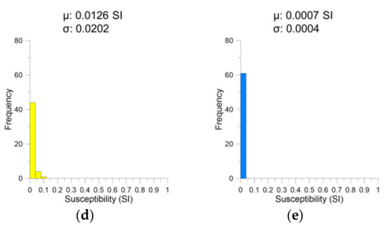 Histograms of susceptibility of rocks including mean (μ) and standard deviation (σ) of (a) underground ore, (b) discovered ore, (c) gabbro, (d) monzodiorite, and (e) quartz monzodiorite.