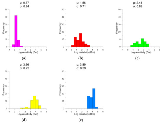 Histograms of logarithmic resistivity of rocks including mean (μ) and standard deviation (σ) of (a) underground ore, (b) discovered ore, (c) gabbro, (d) monzodiorite, and (e) quartz monzodiorite.