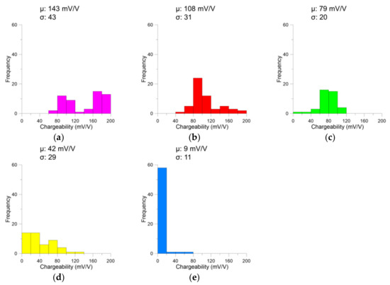 Histograms of chargeability of rocks including mean (μ) and standard deviation (σ) of (a) underground ore, (b) discovered ore, (c) gabbro, (d) monzodiorite, and (e) quartz monzodiorite.