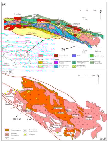 The NQB is predominately composed of three groups: the mid-upper Proterozoic Kuanping group, lower Paleozoic Erlangping group and lower Proterozoic Qinling complex from north to south, with the Waxuezi–Qiaoduan Faults (WQF) and Zhuyangguan–Xiaguan Faults (ZXF) as boundaries [] (Figure 1A). The Erlangping terrane comprises mainly Neoproterozoic–Early Paleozoic backarc basin volcano-sedimentary successions and associated intrusions []. Previous studies have been carried out on most magmatism and each terrane of the NQB, especially on the Paleozoic granites [,,]. The Paleozoic magma evolution is mainly divided into three stages: 505~470 Ma, 450~422 Ma and 415~400 Ma [].