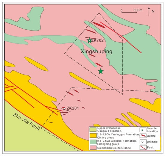 The stratigraphic sequence in the district mainly comprised the Xiaozhai formation of the lower Paleozoic Erlangping group in the north, Yanlinggou formation of the Paleoproterozoic Qinling group in the central to south and upper Cretaceous Gaogou formation in the south (Figure 2). The Xiaozhai Formation consists of fine-grained metaclastic rocks, quartz-micaceous schist, quartz-biotite schist and phyllosilicate plagioclase schist, with flysch protoliths and interbed marbles []. The Yanlinggou formation consists mainly of biotite plagioclase gneiss, dolomitic marble and biotite-quartz schist, with metamorphic overprint greenschist facies []. The deposit is controlled strictly by the secondary faults of the NNW-trending ZXF. The exposed magmatic rocks in the mining area include biotite granite and monzonitic granite. The biotite granites are widespread, and monzonitic granites occur more in the drilling cores.