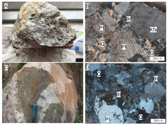 Photographs of samples and photomicrographs of minerals from the Xingshuping Au deposit and surrounding area. (A) Biotite granite (XSP18-6); (B) plagioclase, K-feldspar and quartz in biotite granite; (C) monzonitic granite; (D) plagioclase, K-feldspar and quartz in monzonitic granite. Mineral abbreviations: Pl—plagioclase; Kfs—K-feldspar; Q—quartz; Bt—biotite.