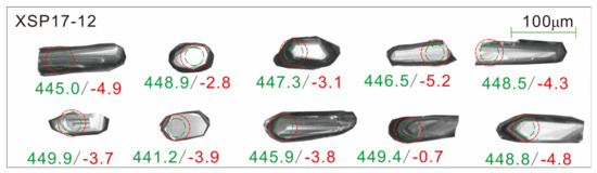 The zircon grains from sample XSP17-12 are euhedral to subhedral, transparent and pale yellow to dark grey in color. Their lengths range from 40 to 150 μm with ratios of 1:1–4:1. They exhibited clear core structure and dark oscillatory zoned rims in CL and BSE images (Figure 4), suggesting magmatic crystallization.