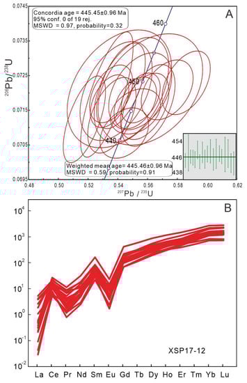 (A) LA-ICP-MS zircon U–Pb concordant curves for the studied granite XSP17-12; (B) chondrite-normalized rare-earth element patterns for the studied granites. Normalized values for chondrite are from [].