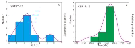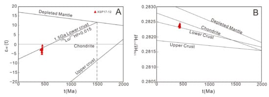 Zircon grains from samples XSP17-12 were analyzed for Lu–Hf isotopes on the same dated spots or morphologically similar domains; the results are listed in Table 5. The initial 176Hf/177Hf ratios denoted by εHf(t) values and Hf model ages for the zircons were by calculated using the U–Pb crystallization ages (t = 446.2 Ma). Histograms of the εHf(t) values for these samples are shown in Figure 6. Ten zircon grains from sample XSP17-12 display initial 176Hf/177Hf ratios varying from 0.282356 to 0.282481. Their corresponding εHf (t) values vary within a narrow range from −5.2 to −0.7, with a weighted mean of −3.7 (Figure 6A). Correspondingly, their single-stage Hf model ages vary from 1.09 to 1.26 Ga, and their two-stage Hf model ages (TDM2) are 1.34–1.59 Ga (mean 1.51 Ga) (Figure 6B, Table 5).