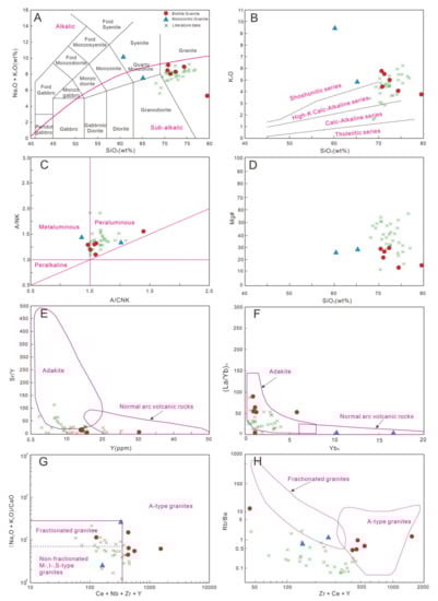 Geochemical classifications of the rocks: (A) total alkalis–silica (TAS) diagram (after []), (B) SiO2 vs. K2O (after []), (C) ANK vs. A/CNK, diagrams for the studied granites (after []), (D) Mg# vs. SiO2 (wt%) diagram, (E) Plots of Sr/Y vs. Y and (F)(La/Yb)N vs. YbN (after []). (G) (K2O + Na2O)/CaO vs. (Ce + Nb + Zr + Y) and (H) Rb/Ba vs. (Zr + Ce + Y) discrimination diagram (after []). Literature data are from [,,,,]).
