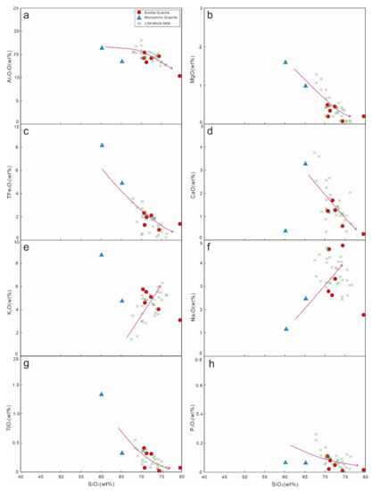 Plots of SiO2 versus major elements (Al2O3, MgO, TFe2O3, CaO, K2O, Na2O, TiO2 and P2O5) of granites from Xingshuping (a–h). Literature data are from [,,,,].