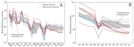 Primitive mantle-normalized multi-element spider (A) and chondrite-normalized rare-earth element (B) diagrams for the studied granites. The values of chondrite and primitive mantle are from [,], respectively. The data of metasedimentary rocks in the North Qinling unit are from [].