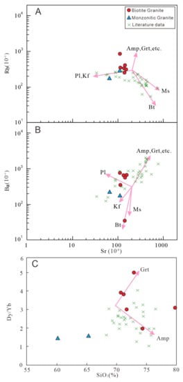 Plots of (A) Sr vs. Rb, (B) Sr vs. Ba and (C) SiO2 vs. Dy/Yb for the samples from Xingshuping. Pl: plagioclase; Kf: K-feldspar; Bt: biotite; Ms: muscovite; Grt: garnet; Amp: amphibole. Literature data are from [,,,,].