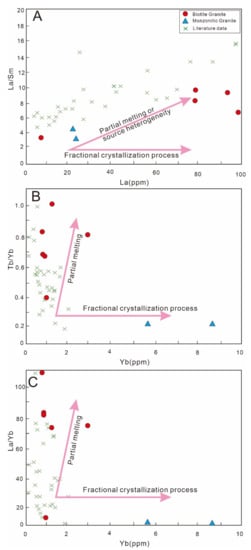 (A) La vs. La/Sm, (B) Yb vs. Tb/Yb and (C) Yb vs. La/Yb diagrams of the samples from Xingshuping. Literature data are from [,,,,].