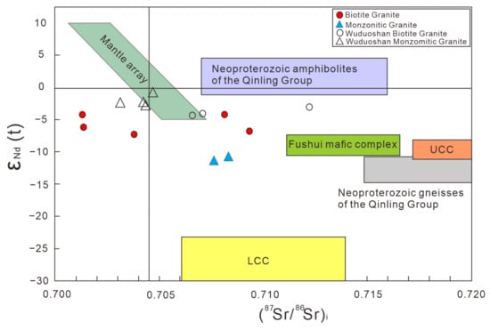 (87Sr/86Sr)i vs. εNd(t) plot for granites from the Xingshuping. Whole-rock Sr–Nd isotopic of Wuduoshan biotite granite and monzomitic granite from []. Fields for the upper continental crust (UCC) and lower continental crust (LCC) are from Jahn et al. [], and the mantle array is from Depaolo and Wasserburg []. Whole-rock Sr–Nd isotopic compositions of the Neoproterozoic Qinling Group and Fushui mafic complex are from Liu et al. [] and references therein and Wang et al. [], respectively. (87Sr/86Sr)i and εNd(t) values are based on t = 446.2 Ma.