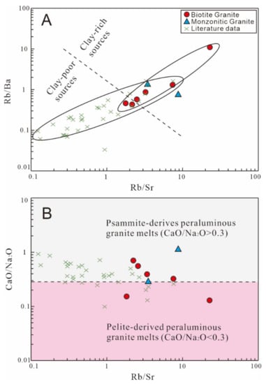Partial melting of different source rocks such as amphibolite, metagreywacke and metapelite will produce various magma compositions under variable melting conditions [,]. The biotite granites and monzonitic granites from Xingshuping exhibit relatively high Rb/Ba (0.46–10.5) and Rb/Sr (1.83–7.18) and are dominantly plotted in the clay-rich sources field, which are different from previous studies that show they are mainly from a clay-poor source Figure 14A. Combined with their relatively high CaO/Na2O (generally >0.3) (Figure 14B), we can conclude their derivation from clay-rich and plagioclase-rich psammitic sources.